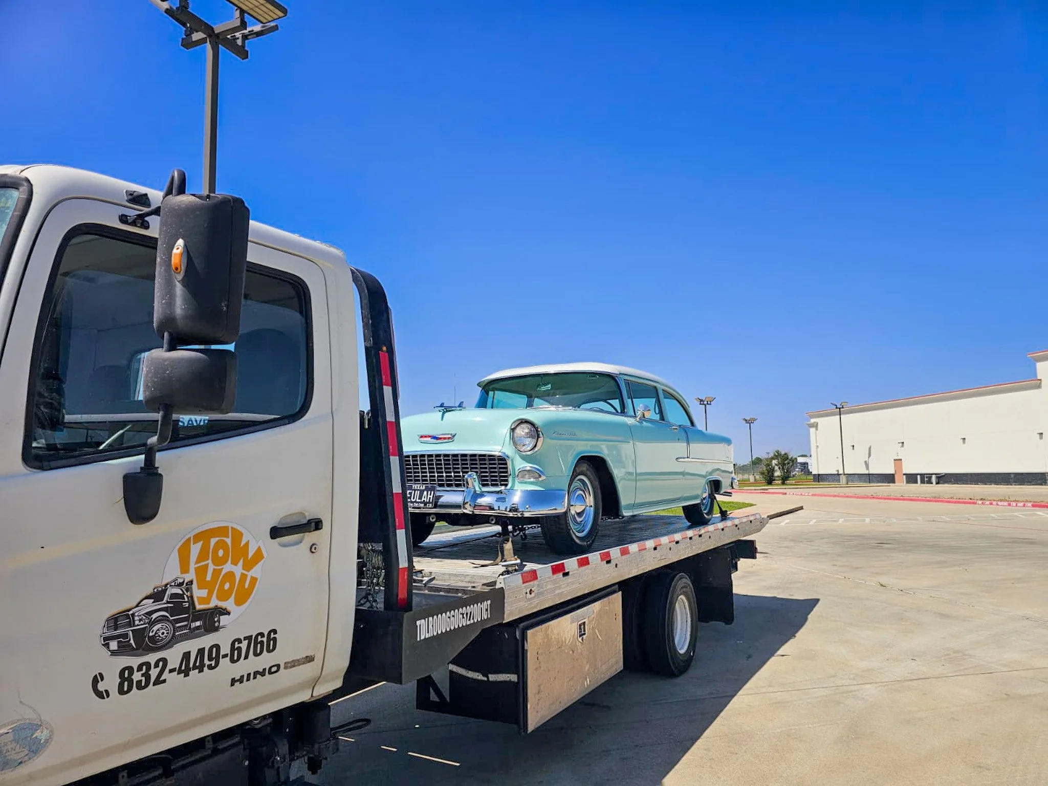 A light blue vintage car, likely from the 1950s, is loaded onto a flatbed tow truck with a white cab, parked in a large, mostly empty parking lot under a clear blue sky.